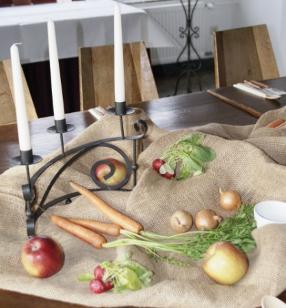 Einfache Jute, ist recht günstig und Wurzelgemüse / Äpfel haben hier eine schöne mittelalterliche Stimmung gezaubert.